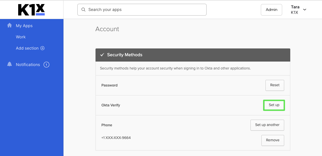 Okta is an identity and access management company based in San Francisco, CA. It provides cloud software that helps companies manage secure user authentication for web-based software applications. K1x uses Okta's enterprise-grade identity management service platform to authenticate and authorize access to K1x applications.Setup Okta Verify