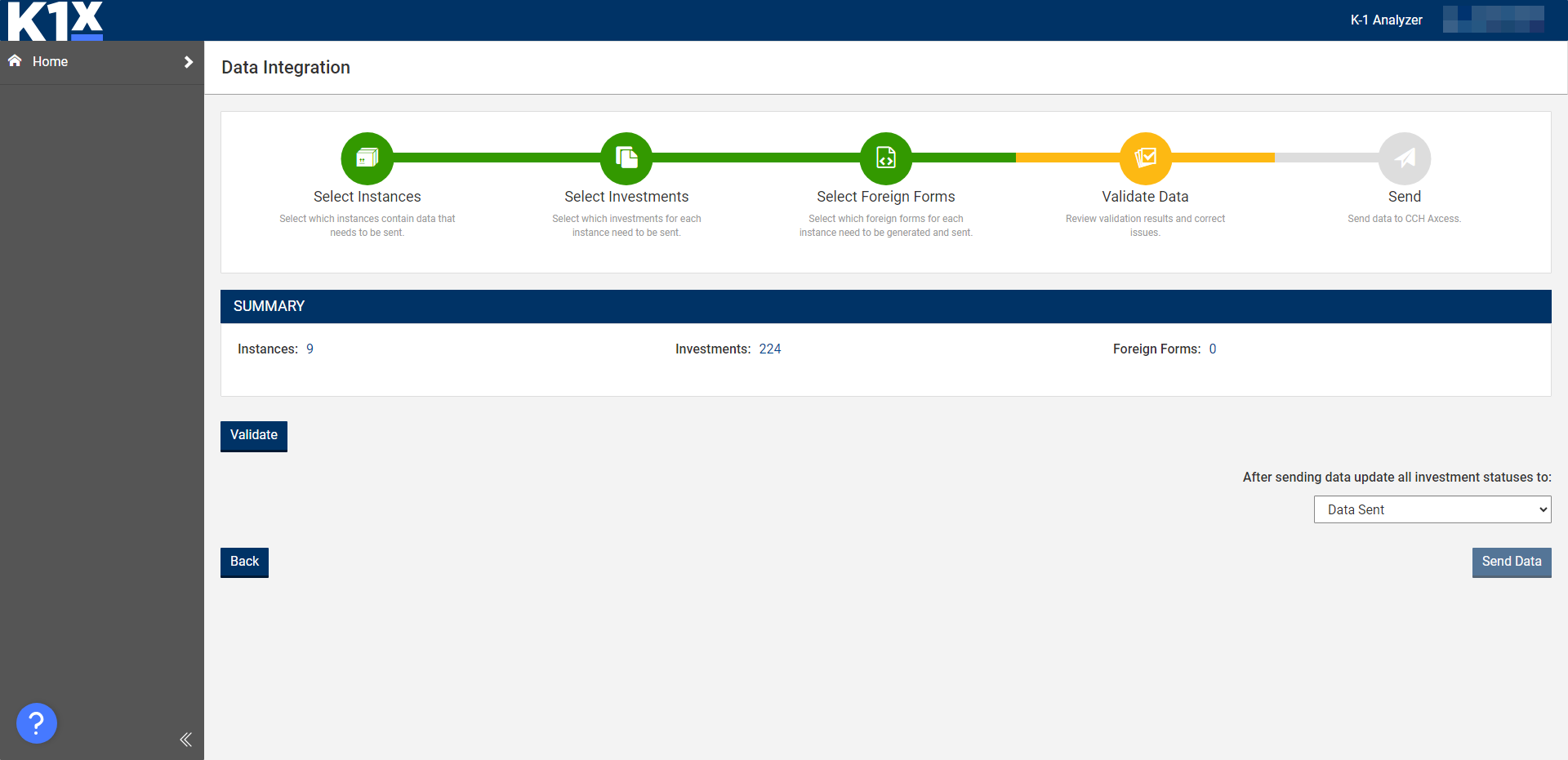 Once all work is done in K1 Aggregator and you are ready to send K-1 data to CCH, navigate to the Home page. To start the integration process, select which instances you would like to include and then select the bulk menu and Send Data to CCH Axcess.