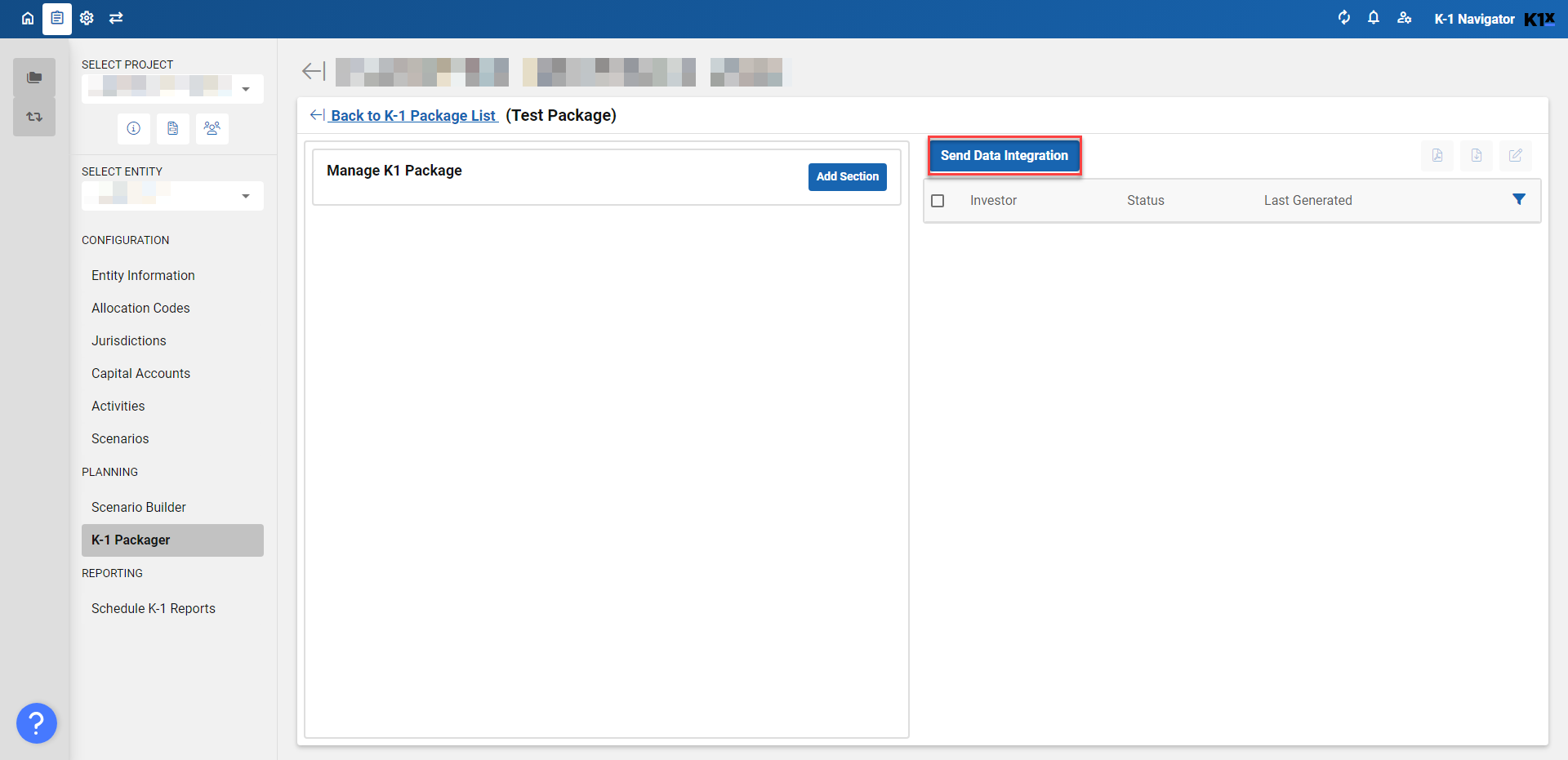 Once all work is done in K1 Creator and you are ready to send K-1 data to CCH, navigate to the K-1 Packager page for the entity. To start the integration process, select which investors you would like to include and then select the Send Data Integration button.