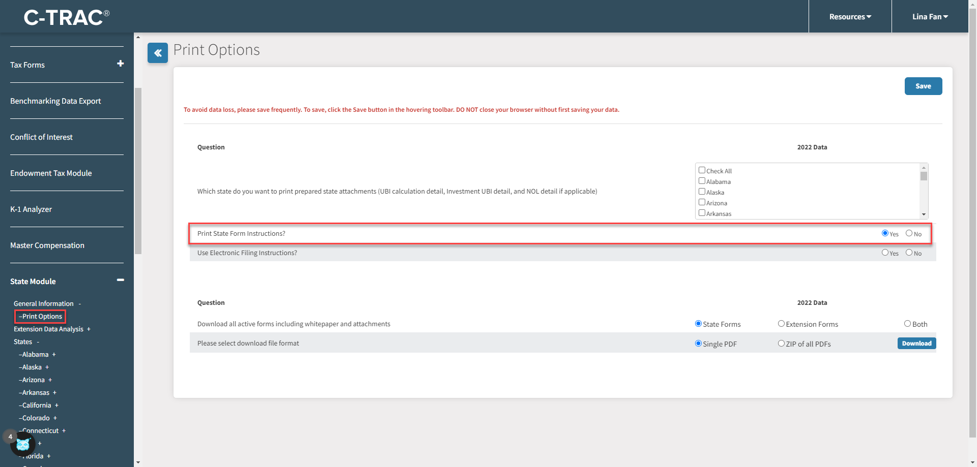 1. First, ensure your print options are turned on under State Module > General Information > Print Options