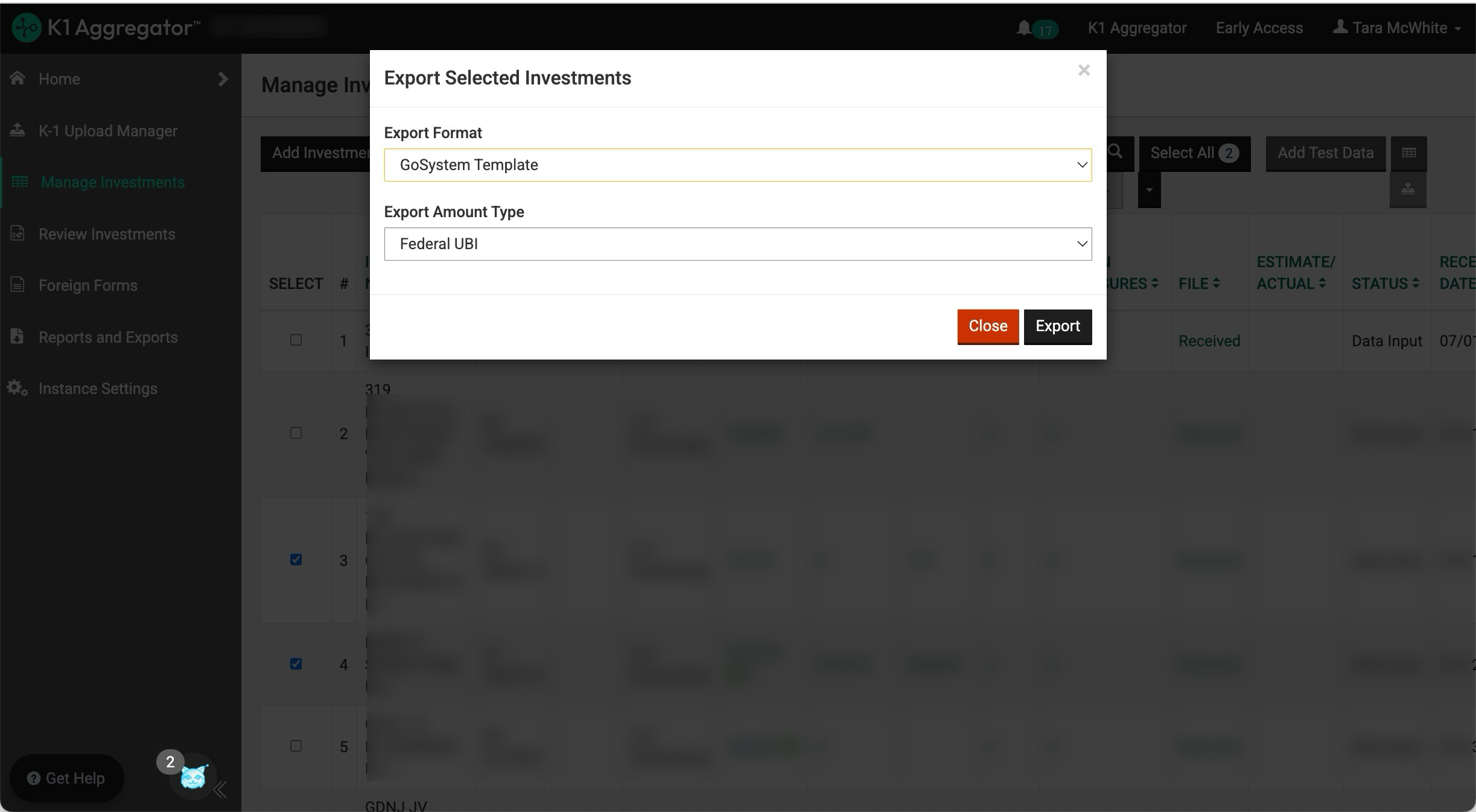 - Select desired Form 1065 investments by checking the checkbox on the left, and choose Export Selected Investment(s) from the dropdown next to Select All.