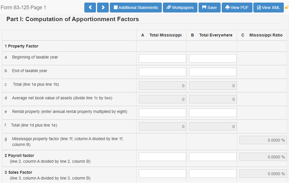 - Navigate to State Module -> States -> Mississippi -> Form 83-125, Page 1, Part I: Computation of Apportionment Factors