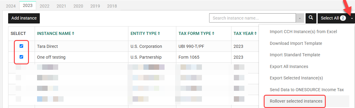 - Check the box(es) for the instances you want to rollover.