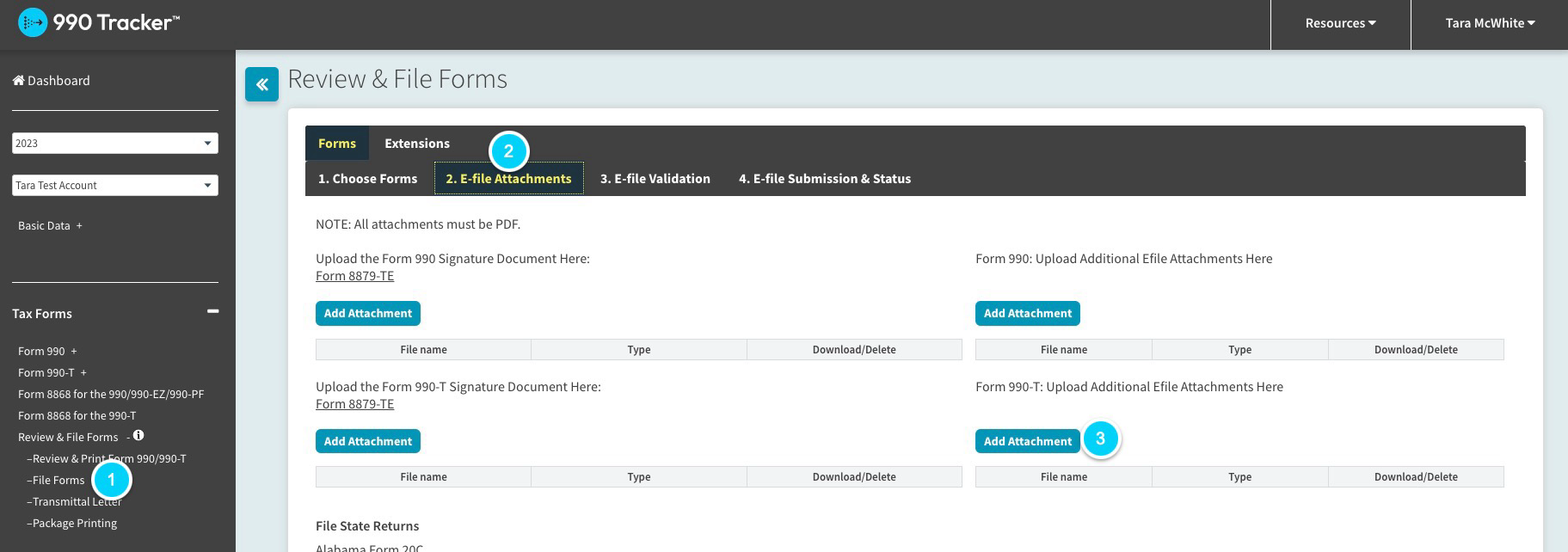 - Click the "Add" button in the "990-T Upload Additional E-file Attachments Here" section