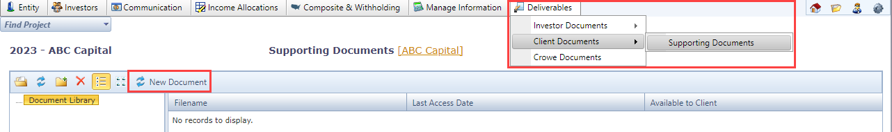 - Under the “Deliverables” drop-down box, select “Client Documents”, then “Supporting Documents.”