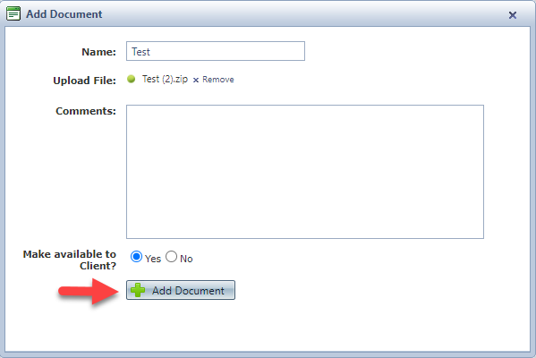 - Give the document a name and add a comment for the client, then upload the file. The upload must be a zip file.