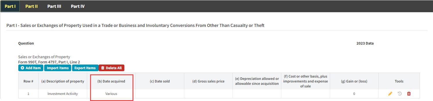 Cause: "Various" being used vs an actual date in a date field in Form 4797.