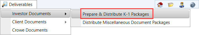 - Navigate to Deliverables -> Investor Documents -> Prepare & Distribute K-1 Packages