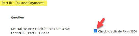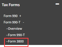 - Form 3800 is now active under Tax Forms -> Form 990-T.