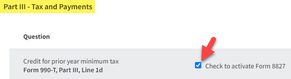 - Check the box to activate Form 8827.
