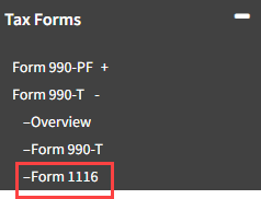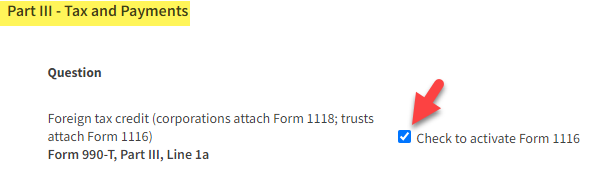 - Form 1116 is now active under Tax Forms -> Form 990-T.