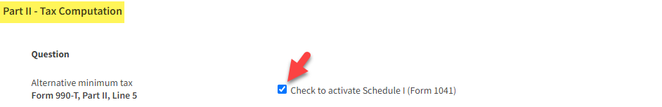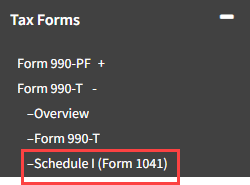 - Schedule I (Form 1041) is now active under Tax Forms -> Form 990-T.