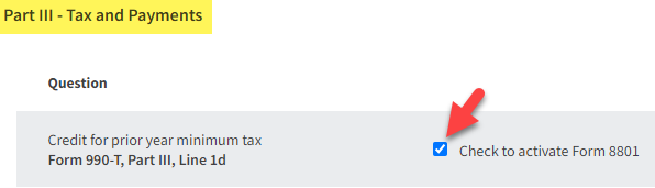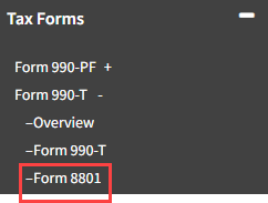 - Form 8801 is now active under Tax Forms -> Form 990-T.