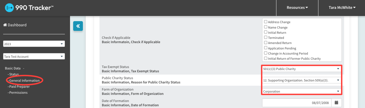 Form 990 Schedule A, Part I, Line 10, is selected based on the entity type assigned in the General Information section: