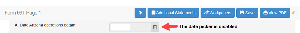Issue: The client is unable to select / input a date for Date Arizona operations began: (Form 99T Page 1). The date picker is disabled.