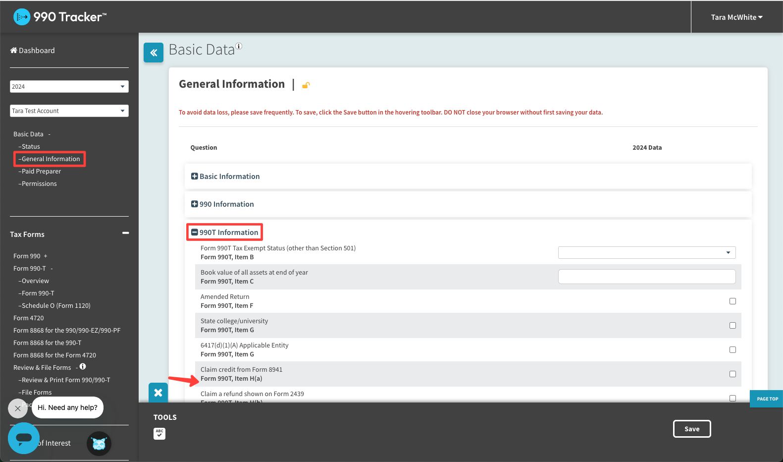 - Scroll down the General Information page until you reach the 990-T section.